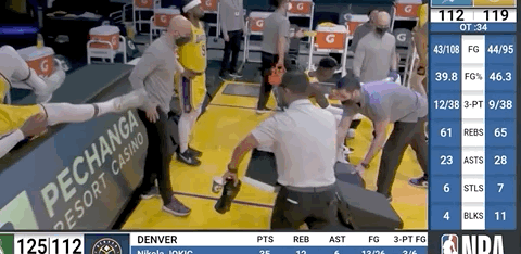 加时赛最后阶段,场上出现了有趣的一幕,连续两场比赛打了三个加时赛、本赛季迄今全勤的詹姆斯躺在场边广告牌上休息。