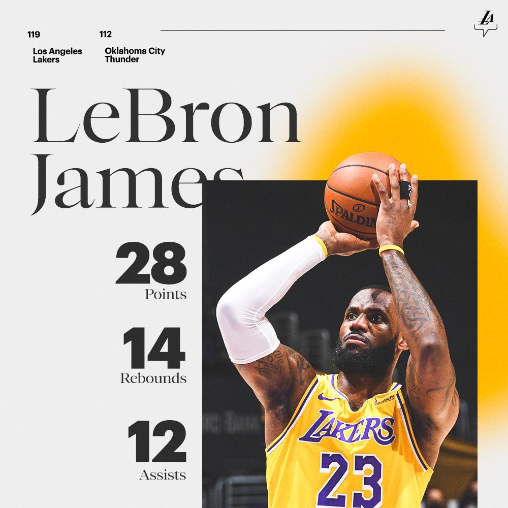 博球00702月09日讯 今日,湖人经过加时苦战以119-112击败雷霆,豪取5连胜。本场比赛,湖人前锋勒布朗-詹姆斯出战42分钟,22投11中得到28分14篮板12助攻,取得个人生涯第97次三双。