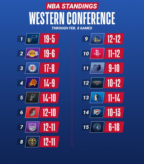 赛后,NBA官方更新推特,晒出今日比赛结束后的最新东西部排名。