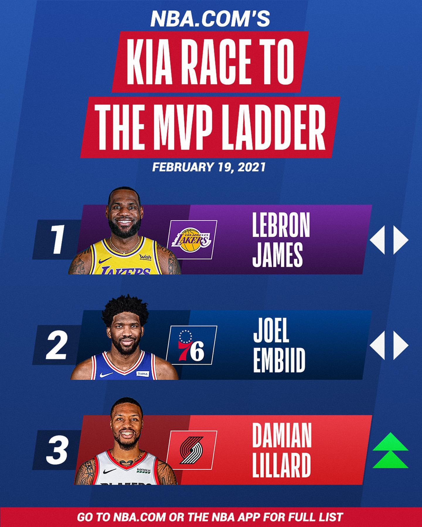 “NBA官网的MVP排行榜:在最新一组的2020-21赛季MVP竞争者中,勒布朗-詹姆斯继续领跑。”NBA官推写道。