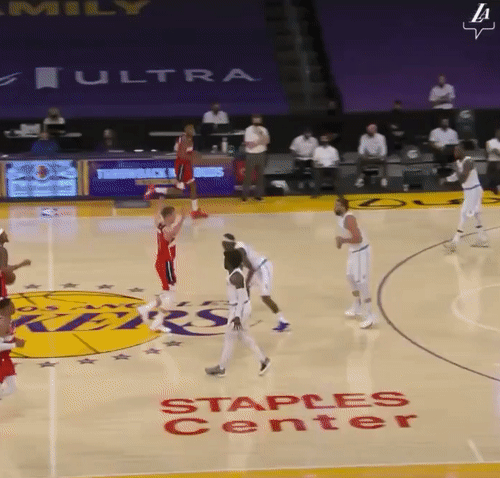 本场比赛第一节的一个回合中,奇才球员布拉德利-比尔持球突破上篮,惨遭湖人球员马克-加索尔帽出底线。