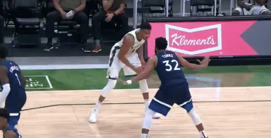 本场比赛上半场雄鹿的一个进攻回合中,雄鹿球员扬尼斯-阿德托昆博生突卡尔-安东尼-唐斯隔扣得手。