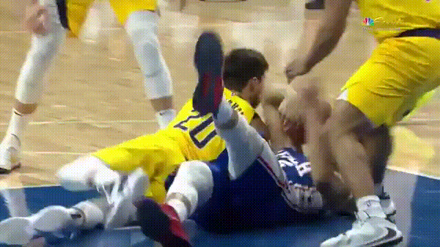 步行者球员道格-麦克德莫特在一次拼抢中,脸部被本-西蒙斯的肘部打中,牙齿被打掉,退出了本场比赛。