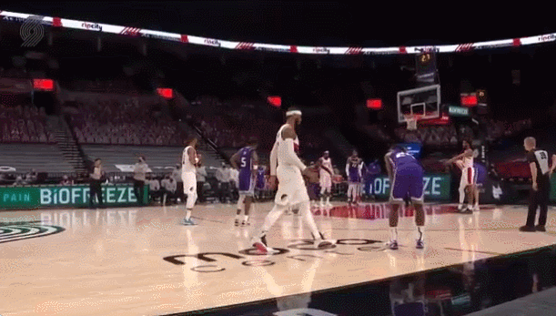 比赛期间出现了有趣的一幕,达米安-利拉德执行罚球时,卡梅罗-安东尼在三分线外对着巴迪-希尔德轻轻一推,后者立刻倒地。