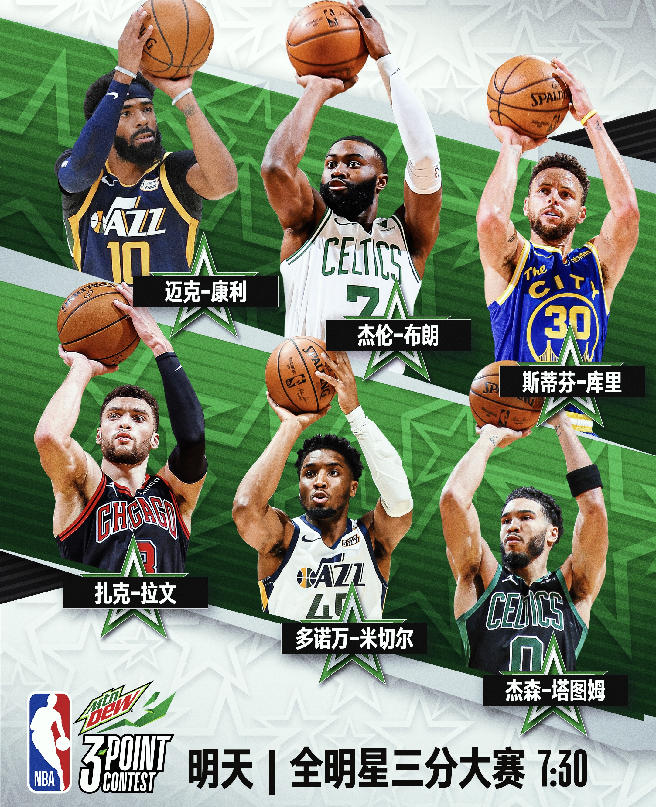 三分球大赛:参赛者——杰伦-布朗、斯蒂芬-库里、扎克-拉文、多诺万-米切尔、杰森-塔特姆、迈克-康利(替换德文-布克)。