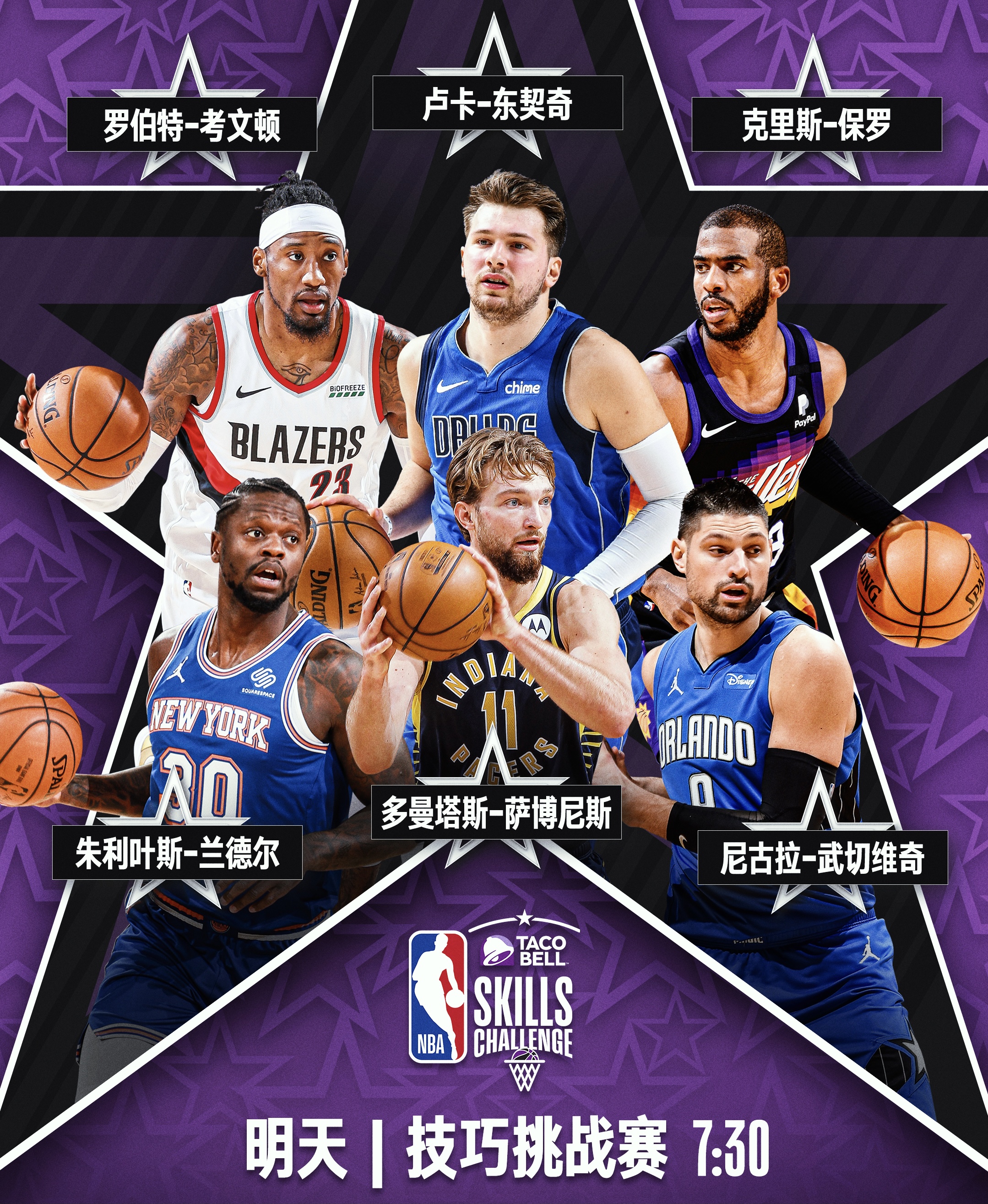 技巧挑战赛:参赛者——克里斯-保罗、卢卡-东契奇、罗伯特-科温顿、尼古拉-武切维奇、多曼塔斯-萨博尼斯、朱利叶斯-兰德尔。