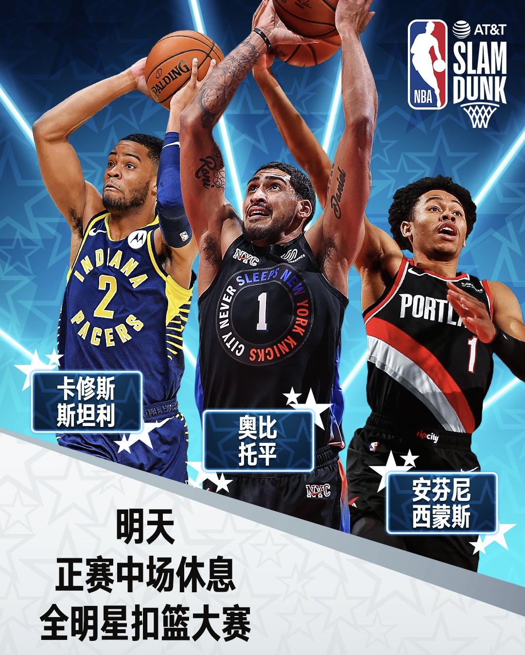 扣篮大赛:参赛者——卡修斯-斯坦利、奥比-托平、安芬尼-西蒙斯。