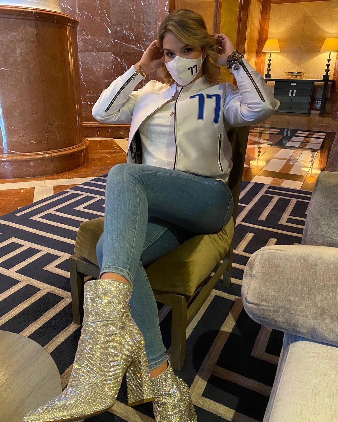 博球00703月08日讯 今日,独行侠前锋卢卡-东契奇的女友更新了个人Instagram,晒出自己身着印有77字样外套的靓照为东契奇全明星加油。