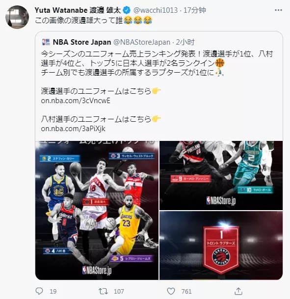 渡边雄太也转发了这条推特,写道:“这个图里的渡边雄大是谁啊(笑哭)?”