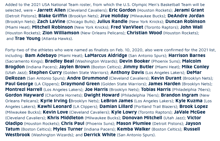 这15人分别为:贾莱特-阿伦、埃里克-戈登、杰里米-格兰特、布雷克-格里芬、朱-霍勒迪、德安德烈-乔丹、扎克-拉文、朱利叶斯-兰德尔、邓肯-罗宾逊、米切尔-罗宾逊、弗雷德-范弗利特、约翰-沃尔、蔡恩-威廉森、克里斯蒂安-伍德、特雷-杨。