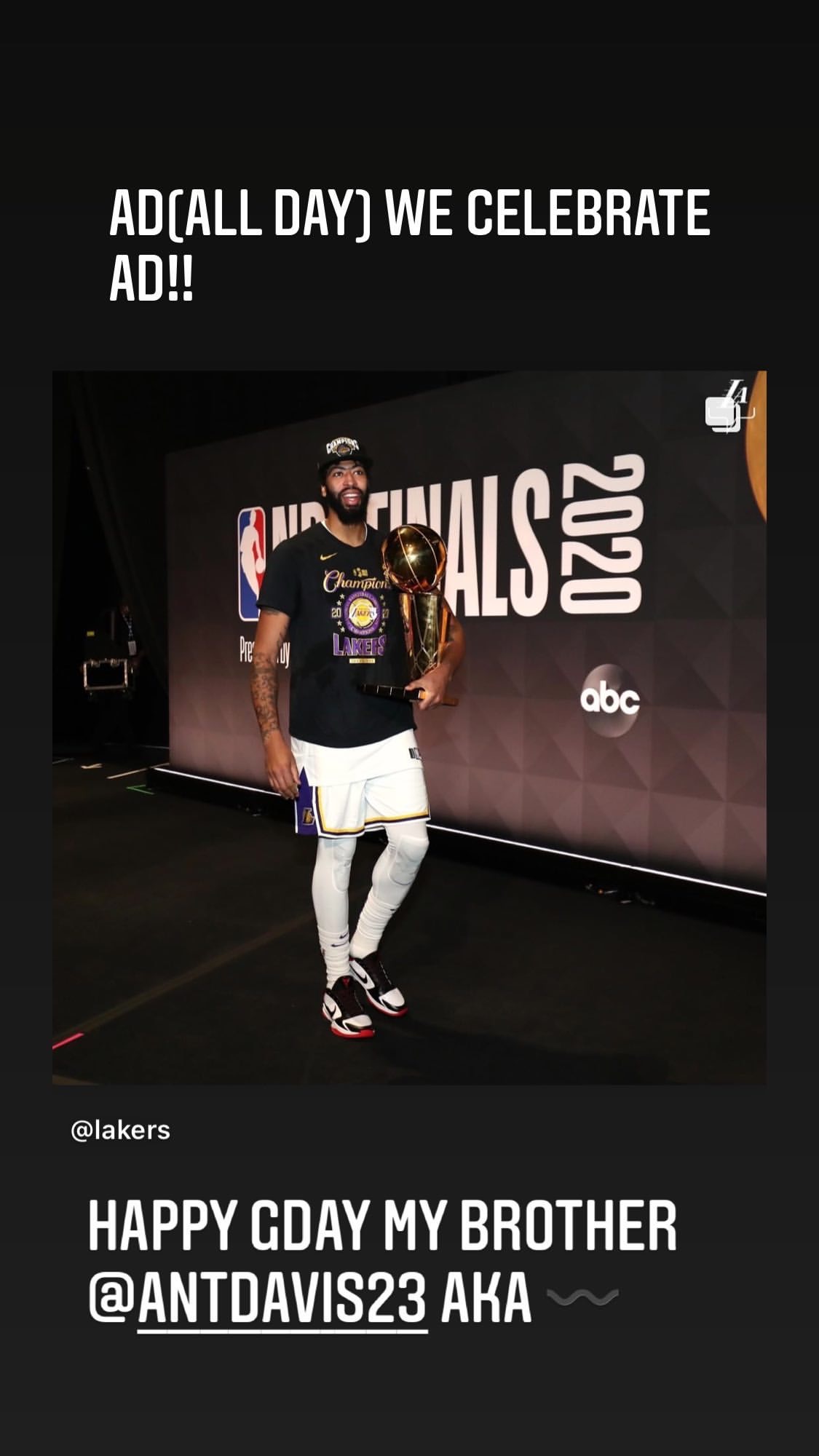 博球00703月12日讯 湖人前锋勒布朗-詹姆斯今日更新Instagram Story,祝福队友安东尼-戴维斯28岁生日快乐。