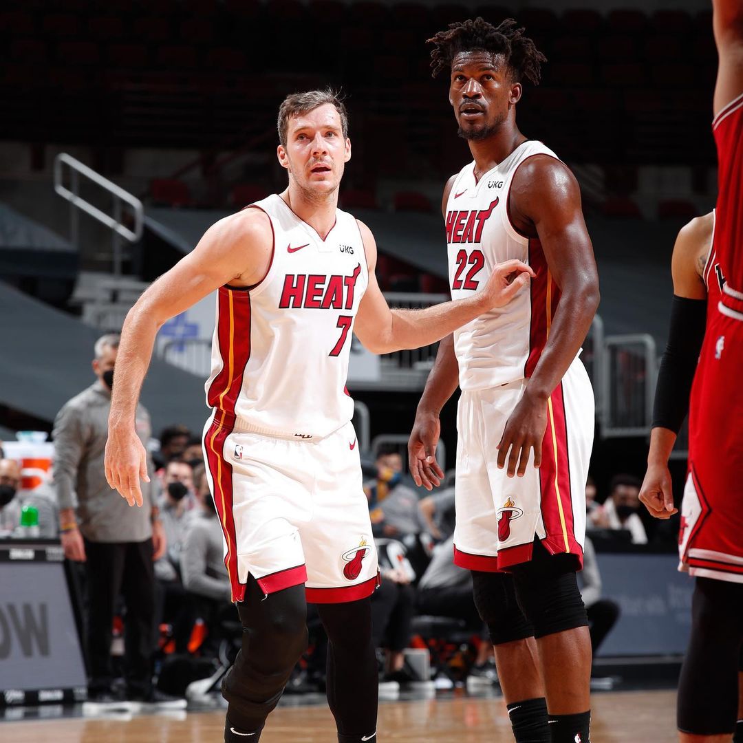 赛后,热火球员吉米-巴特勒更新Instagram晒出一张与队友戈兰-德拉季奇的赛场照(见新闻配图),配文写道:“给这张照片取个标题。”