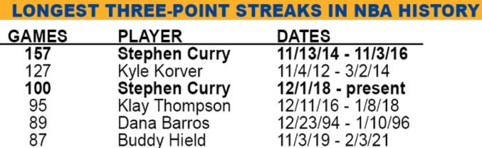 目前连续命中三分球场次的纪录仍然由库里自己保持,是157场。