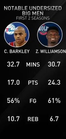 博球00703月17日讯 今天,有媒体晒出了鹈鹕球员蔡恩-威廉森和NBA名宿查尔斯-巴克利生涯前两个赛季的数据对比。