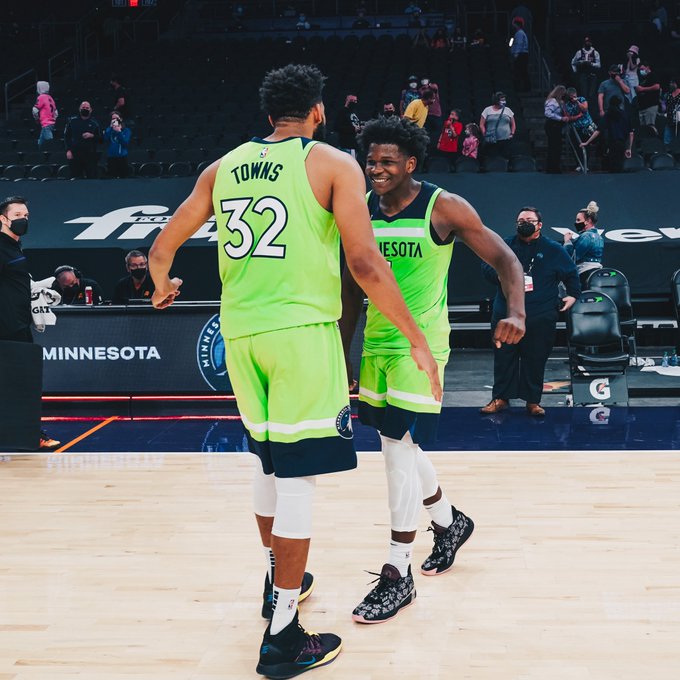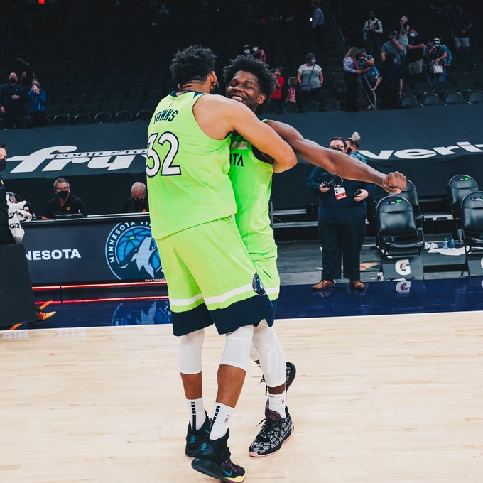 赛后,森林狼官方更新推特,晒出一组森林狼球员卡尔-安东尼-唐斯与安东尼-爱德华兹庆祝胜利的照片与球迷分享。