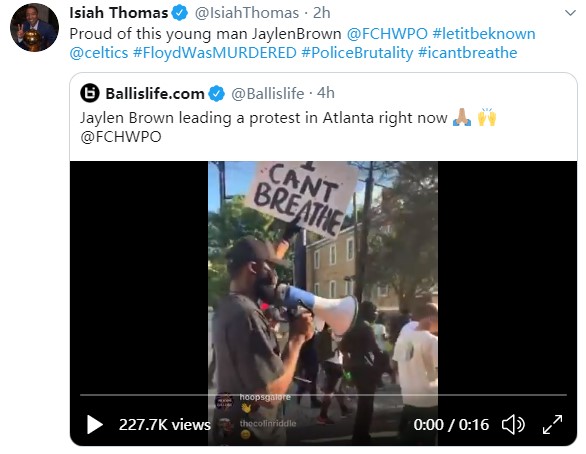 快速比分5月31日讯 今日,名人堂球员伊赛亚-托马斯更新个人社交媒体Twitter,转发并称赞了凯尔特人球员杰伦-布朗领导游行的视频。