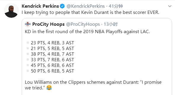 帕金斯转发了这条推特,并评论道:“我一直跟大家说的就是,凯文-杜兰特是历史最强得分手。”