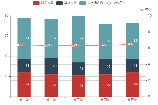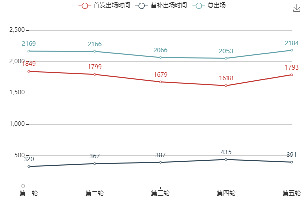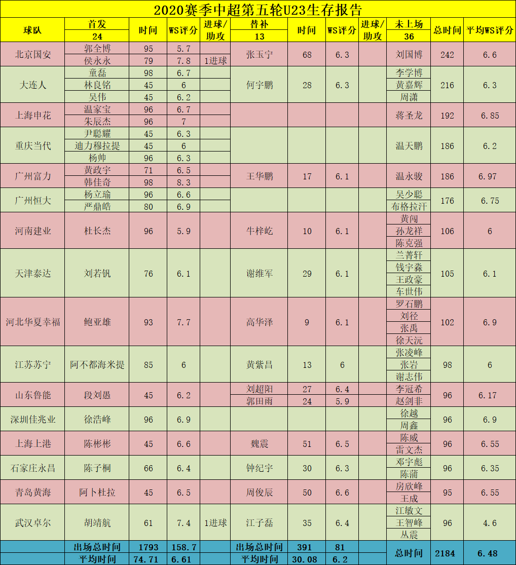 本轮共有74名U23球员出现在大名单中。其中,24名球员首发出场,合计出场1793分钟,人均出场74分钟;13名U23球员替补出场,合计出场391分钟。37名球员总计出场2184分钟,是开赛以来出场时间最多的一轮。北京国安以242分钟,成为时间最多的球队。
