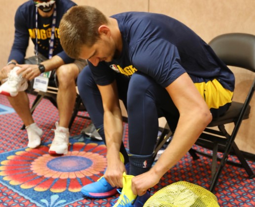 看球吧7月16日讯 今天,掘金官方更新推特,晒出球队中锋尼古拉-约基奇在训练期间系鞋带的照片。 掘金官推写道:“是时候系好鞋带了!”