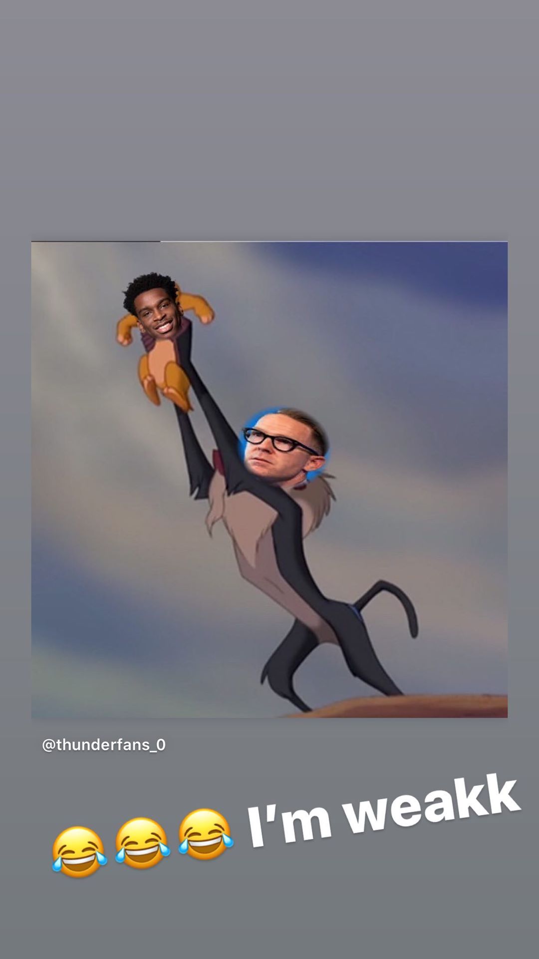 看球吧7月13日讯 雷霆后卫谢伊-吉尔杰斯-亚历山大更新了个人Instagram Story,晒出一张雷霆球迷合成的趣图,该图为动画片《狮子王》的经典场景。狒狒