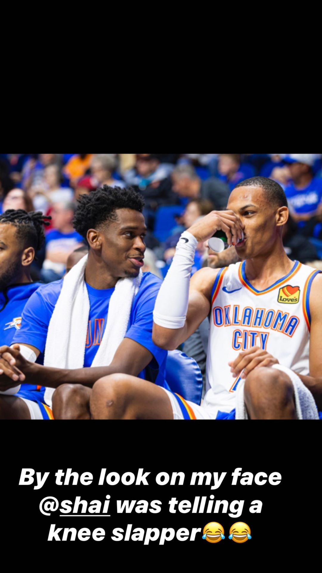 看球吧7月13日讯 今日,雷霆球员达里厄斯-贝兹利更新了个人Instagram Story,发布了自己与队友谢伊-吉尔杰斯-亚历山大的赛场合照,并给照片P上了口