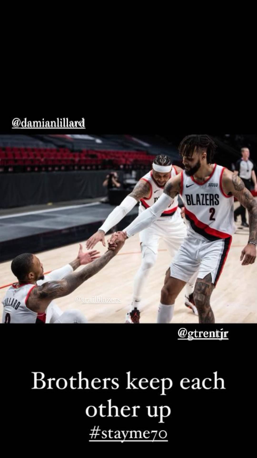 博球00702月04日讯 今日,开拓者前锋卡梅罗-安东尼更新Instagram快拍,晒出队友达米安-利拉德和加里-特伦特在比赛中拉起自己的照