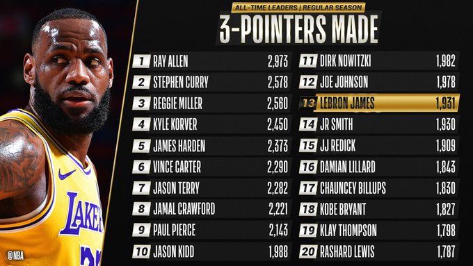詹姆斯生涯常规赛三分命中数超越JR,升至历史第13位