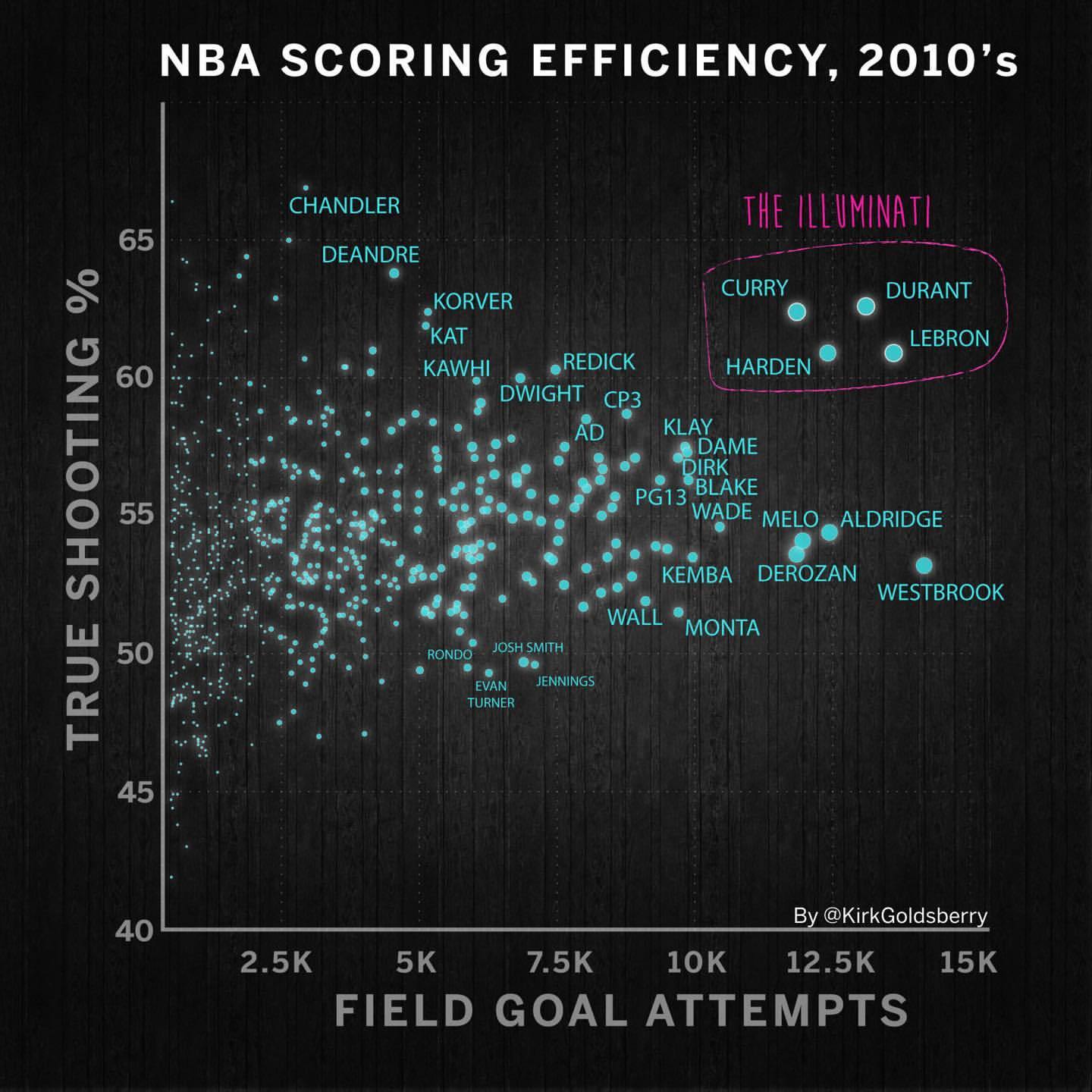 2010年代得分效率分布图:詹姆斯、KD、库里、哈登脱颖而出