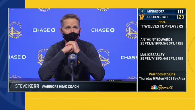 博球00701月28日讯 今天勇士123-111战胜森林狼,赛后勇士主教练史蒂夫-科尔接受了记者采访。 谈到詹姆斯-怀斯曼,科尔称赞了怀斯