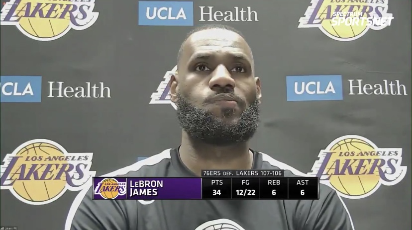 博球00701月28日讯 今日,湖人106-107客场惜败于76人。赛后,湖人前锋勒布朗-詹姆斯接受了采访。 谈到球队的三分表现,詹姆斯说: