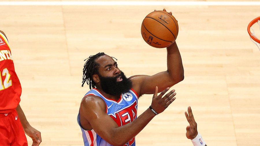 博球00701月28日讯 在今日结束的NBA常规赛中,篮网以132-128战胜老鹰。 本场比赛中,篮网球员詹姆斯-哈登出场45分钟,砍