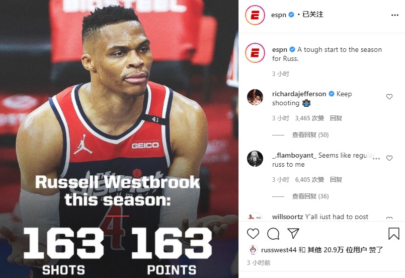 心大!威斯布鲁克Ins点赞自己163次出手得163分的相关新闻