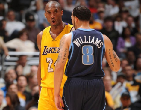 博球00701月27日讯 前NBA球员德隆-威廉姆斯今日更新Instagram晒出一张与已故湖人名宿科比-布莱恩特的昔日赛场照(见新闻配图)