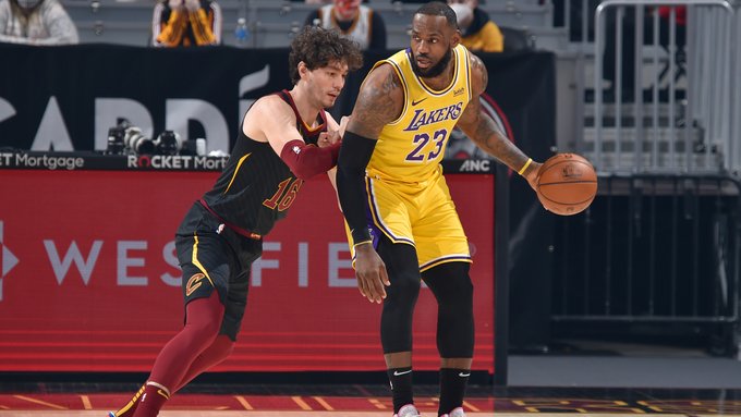 博球00701月26日讯 在今日结束的一场常规赛中,湖人以115-108击败骑士。美媒晒出了湖人球员勒布朗-詹姆斯在比赛中与前队友凯文-乐福