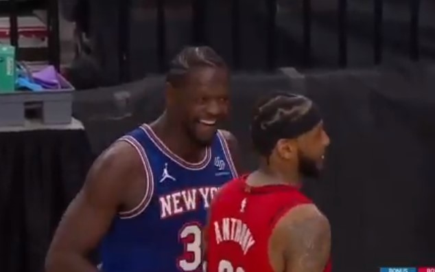 聊啥呢?比赛最后时刻,安东尼与兰德尔在场边有说有笑