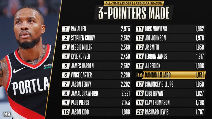 利拉德生涯三分命中数超越比卢普斯,升至历史第16