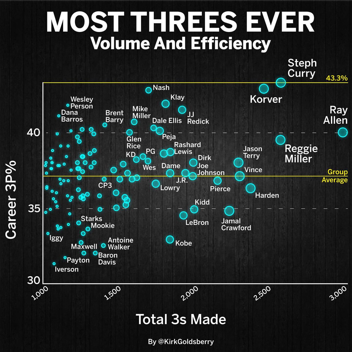 历史球员生涯三分分布图:库里命中数第二,命中率第一