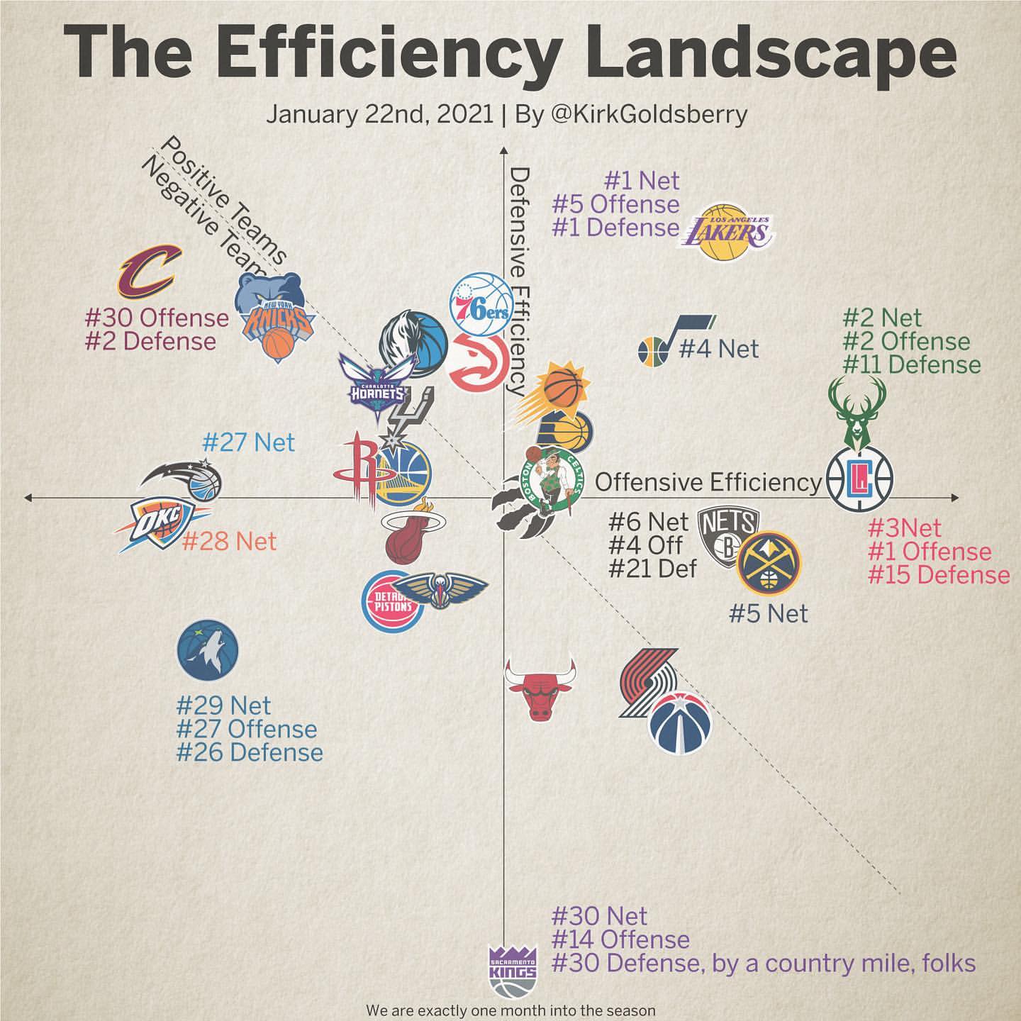 博球00701月22日讯 今日,NBA数据专家Kirk Goldsberry在Instagram上更新了截止目前最新的全联盟攻防效率分布图。