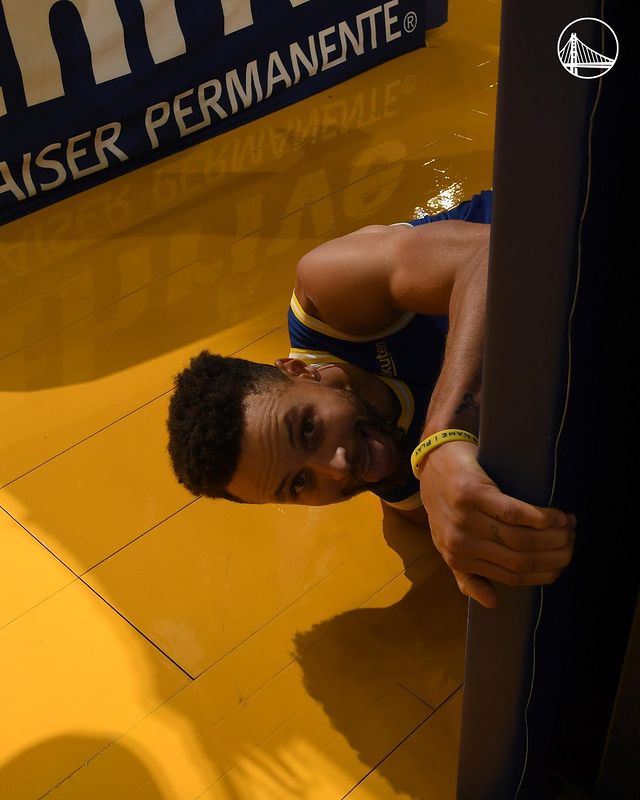 博球00701月22日讯 今日,勇士官方更新了推特,晒出了勇士后卫斯蒂芬-库里在主场对尼克斯比赛中的趣图 。 勇士官方写道:“哈哈哈嗨斯蒂