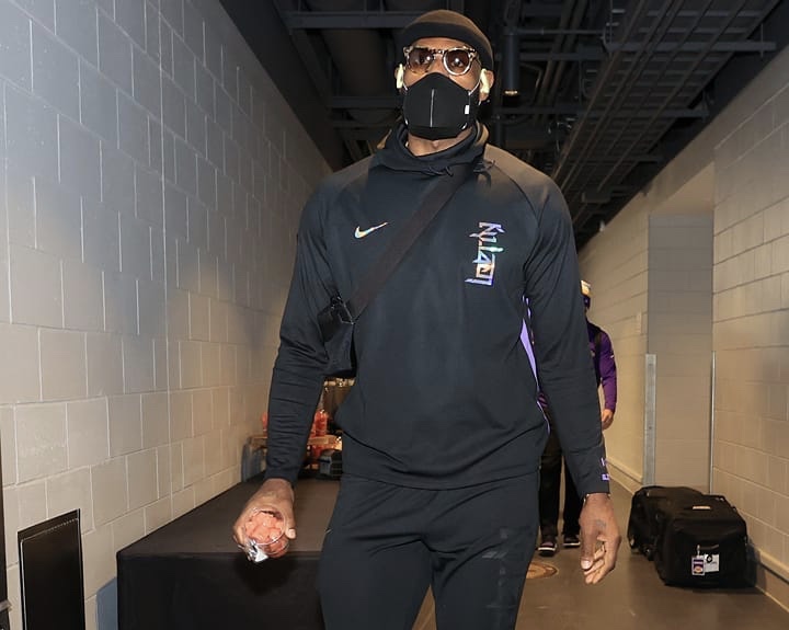 博球00701月22日讯 湖人前锋勒布朗-詹姆斯今日更新Instagram Story,转发自己的赛前装扮。 詹姆斯身穿一套与法国球星姆巴联