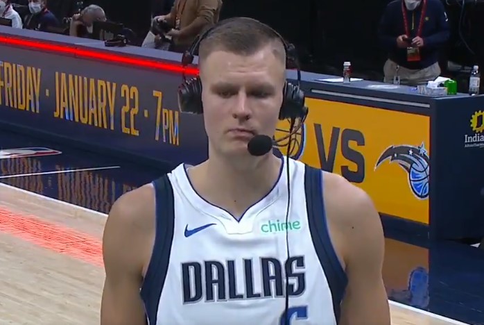 博球00701月21日讯 在今天结束的一场比赛中,独行侠以124-112战胜步行者。 赛后,独行侠球员克里斯塔普斯-波尔津吉斯在场边接受媒