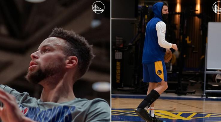 水花出镜!勇士官推晒球队训练照:克莱戴护具训练