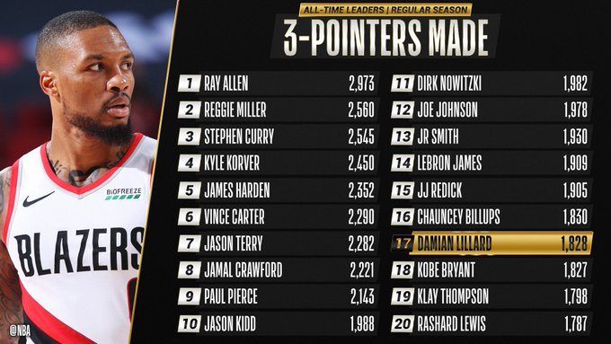 利拉德生涯常规赛三分命中数超越科比,升至历史第17位