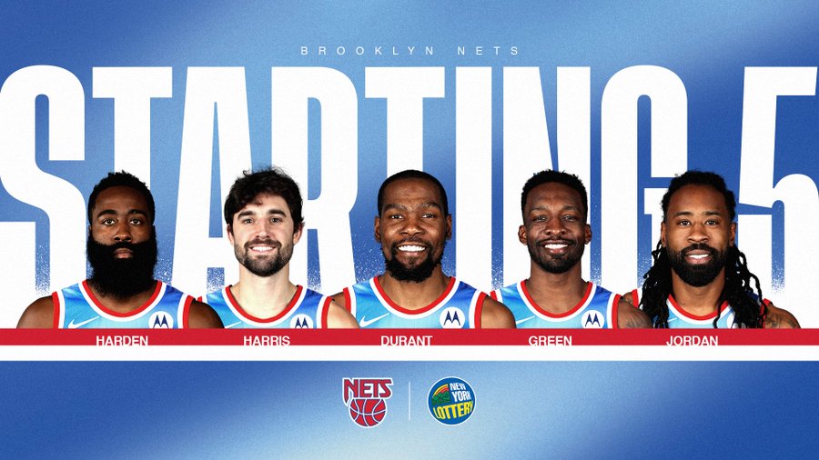 篮网今日首发:哈登,哈里斯,杜兰特,格林,小乔丹