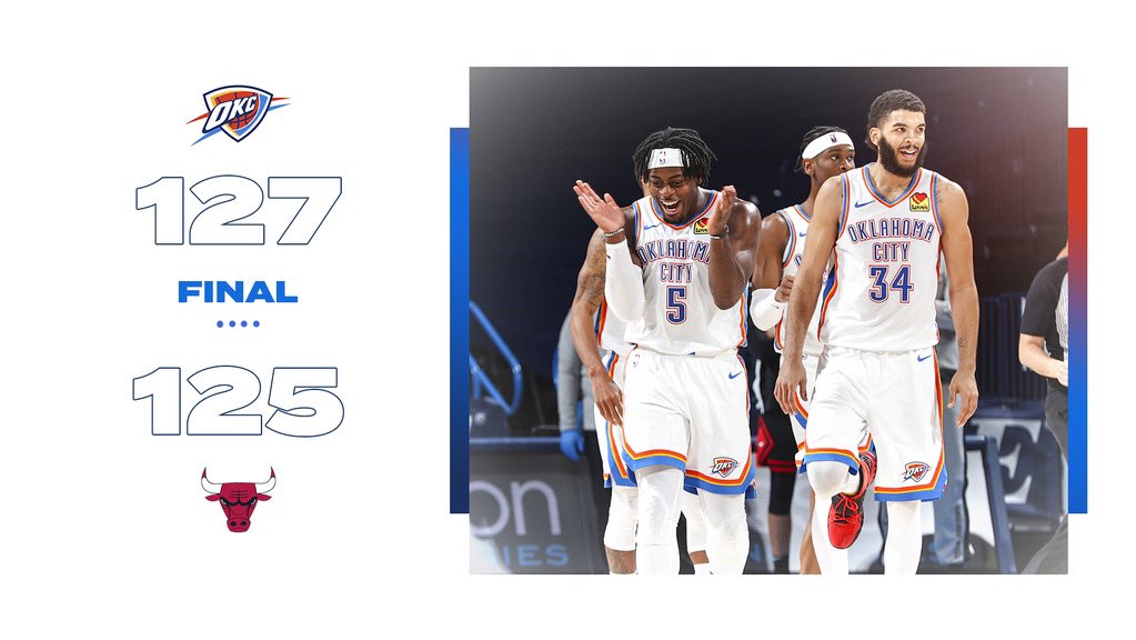 博球00701月16日讯 在刚刚结束的一场比赛,雷霆加时以127-125击败公牛。 这是雷霆本赛季首次在主场赢球,本场之前,雷霆主场0胜5负