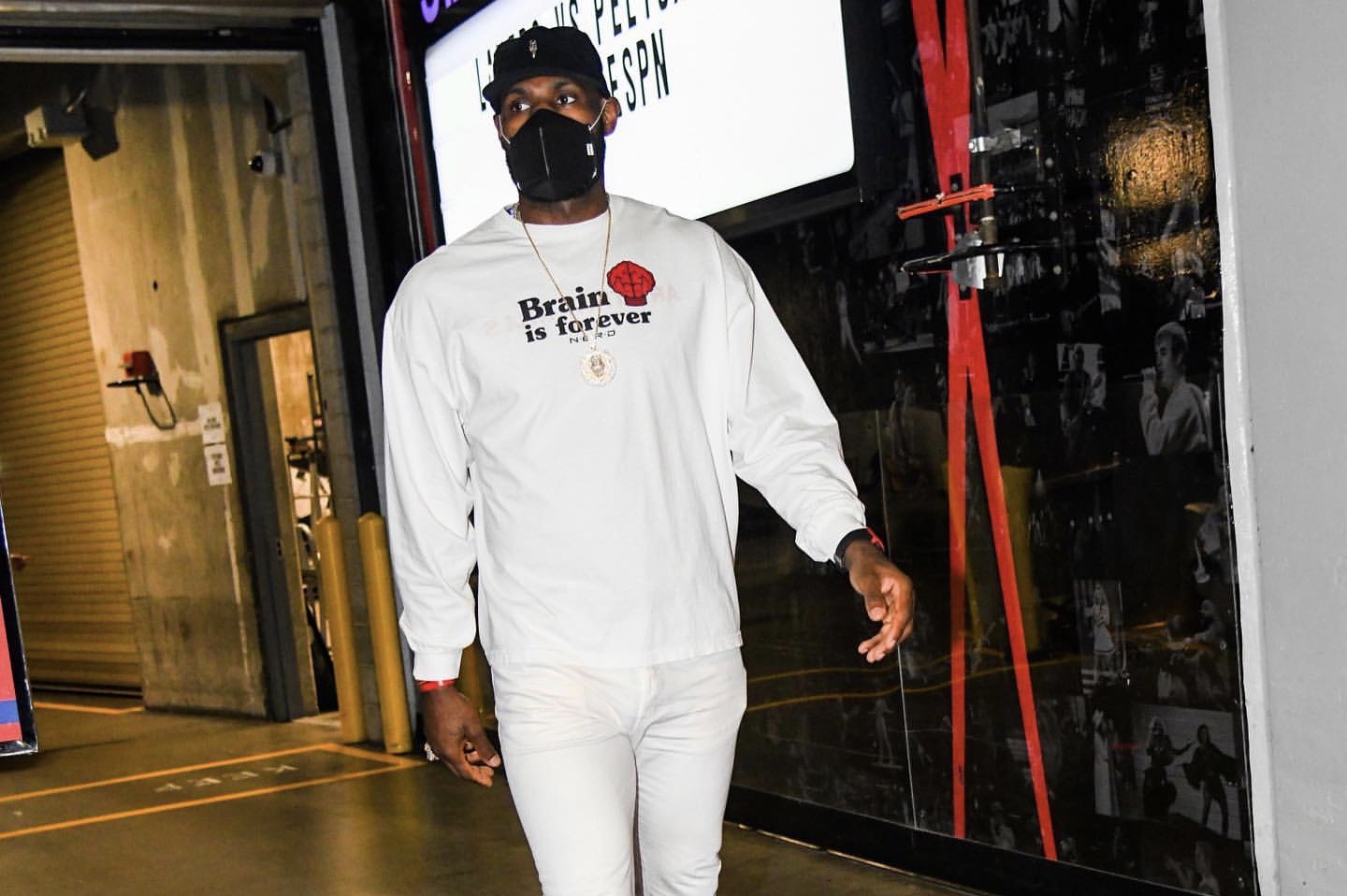 博球00701月16日讯 湖人前锋勒布朗-詹姆斯今日更新Instagram,晒出他的赛前入场照。 詹姆斯今日身着一件印有大脑图案和“头脑是永