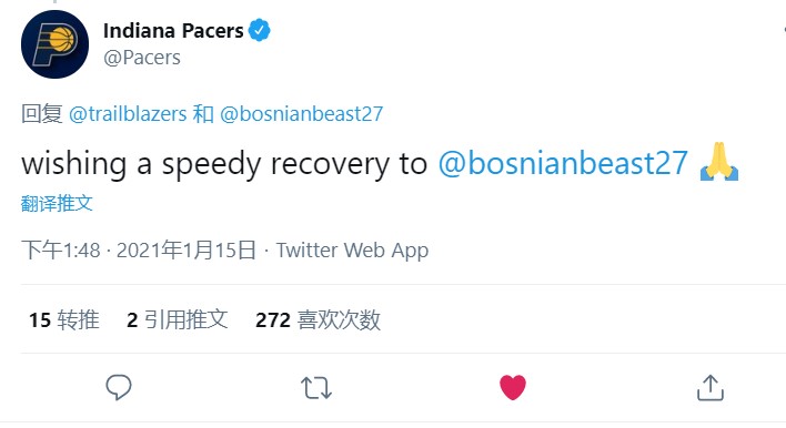 有风度!步行者官方更推:祝努尔基奇早日康复!