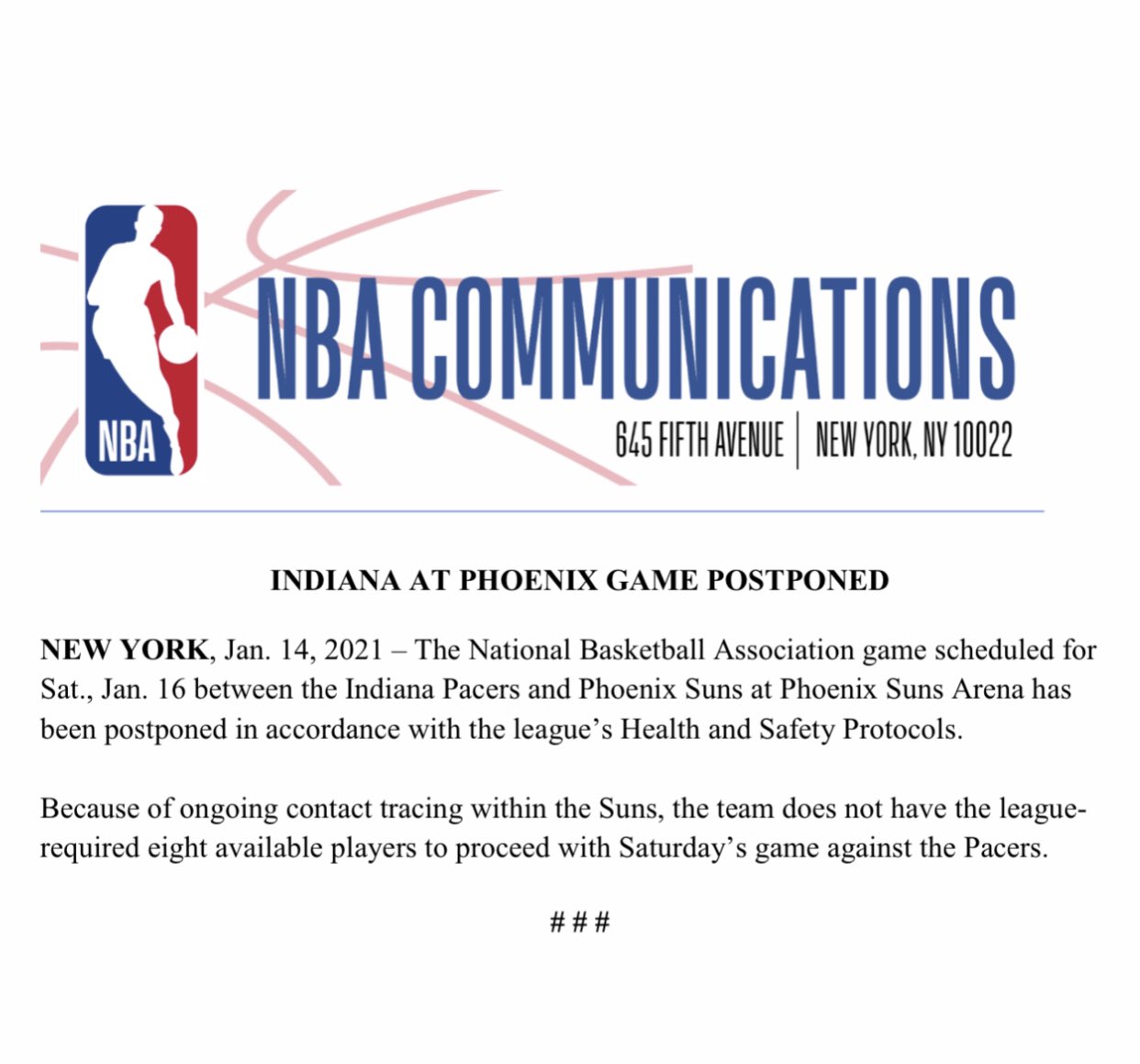 Stein:本周日太阳对阵步行者的比赛将延期进行