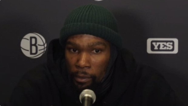 博球00701月14日讯 在今天结束的一场比赛中,篮网以116-109战胜尼克斯。 赛后,篮网前锋凯文-杜兰特接受媒体采访。 杜兰特首先