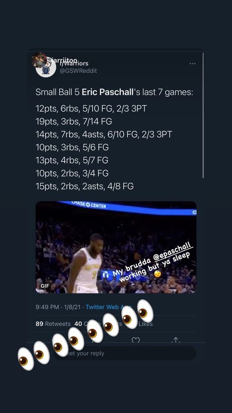 博球00701月10日讯 今日,勇士球员埃里克-帕斯卡尔更新个人Instagram Story,转发自己过去七场比赛担任小球阵容五号位时的数